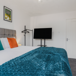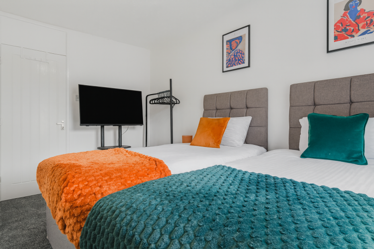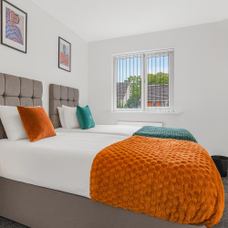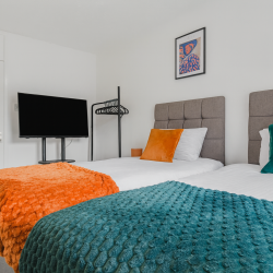 After a busy day in the city, head into the cosy living room where comfortable seating and a Smart TV create the ideal setting for movie nights or quiet downtime. Every bedroom is designed with comfort in mind, featuring Smart TVs, soft bedding and a peaceful atmosphere that guarantees a great night’s sleep. The layout suits colleagues sharing, families needing room to settle in or groups travelling together. Each room has a lock for privacy.